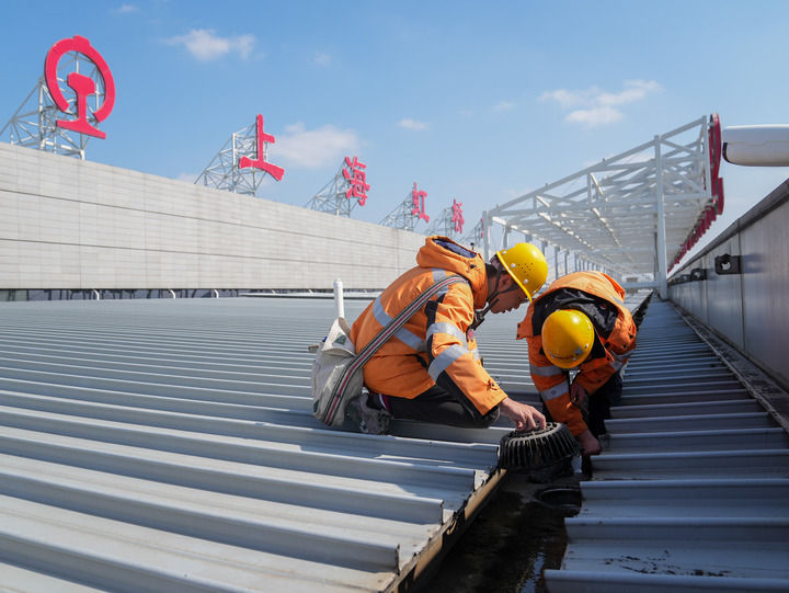 2月17日,中國鐵路上海局集團有限公司上海房建公寓段的工作人員在上海虹橋火車站的屋面鋼結(jié)構(gòu)上清理垃圾。新華社記者 丁汀 攝