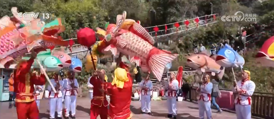 記者身后的九鯉湖景區(qū),湖光山色、層巒疊翠,展現(xiàn)出南方山岳特有的靈秀。景區(qū)里最熱門的打卡點(diǎn)之一,叫做“一線天”。這里最窄處不到30厘米,一次只能容一人貼壁通過,游客需要側(cè)身慢慢穿行,在狹窄石縫間體驗(yàn)攀登的樂趣。記者身旁正在巡游的就是當(dāng)?shù)氐姆沁z——店下魚燈。大家看,一盞盞彩繪魚燈隨著隊(duì)伍前進(jìn)上下擺動(dòng),像魚兒在水里游,特別靈動(dòng)。在過去,漁民會(huì)用魚燈祈愿出海平安、豐衣足食。過年的時(shí)候看魚燈,也寓意“年年有余、風(fēng)調(diào)雨順”。
