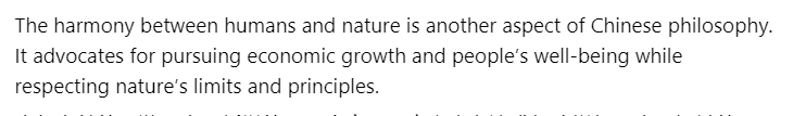 文章還認(rèn)為,人與自然的和諧是中國哲學(xué)的另一個方面。它主張在追求經(jīng)濟增長和人民福祉的同時,尊重自然的發(fā)展規(guī)律。