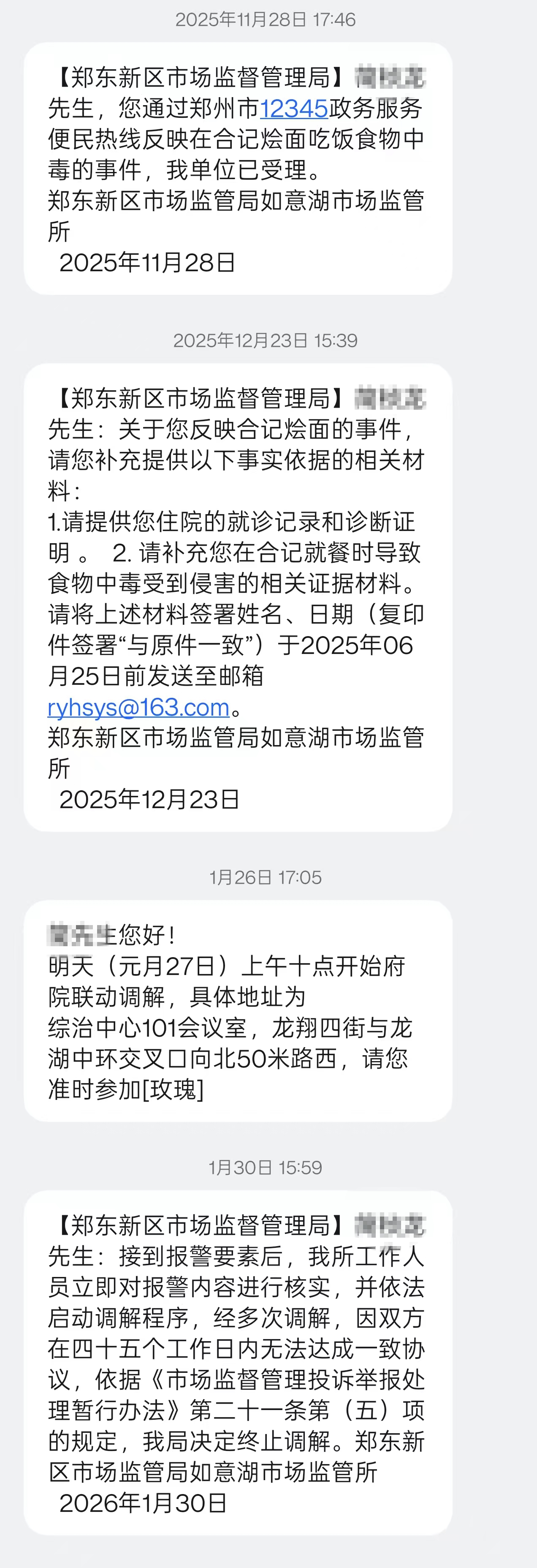 此后,鄭東新區(qū)市場(chǎng)監(jiān)督管理局向簡(jiǎn)先生表示:經(jīng)多次調(diào)解,因雙方在四十五個(gè)工作日內(nèi)無(wú)法達(dá)成一致協(xié)議,依據(jù)《市場(chǎng)監(jiān)督管理投訴舉報(bào)處理暫行辦法》第二十一條第(五)項(xiàng)的規(guī)定,我局決定終止調(diào)解。