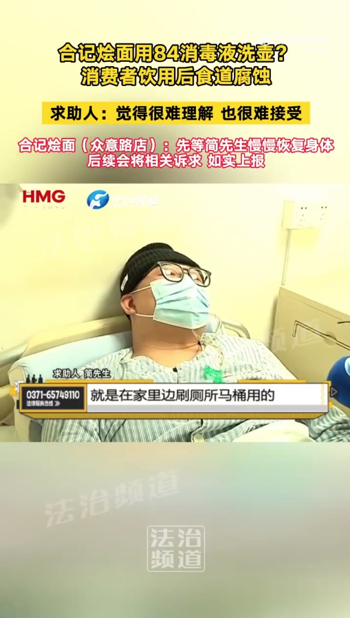 中新網(wǎng)北京3月16日電(記者 劉星晨)“現(xiàn)在胃和食道還覺(jué)得疼,吃東西以流食和半流食為主,吞咽饅頭這種會(huì)有困難。”在簡(jiǎn)先生的講述里,由于在鄭州合記燴面眾意路店用餐期間喝到了含有84消毒液的水,他過(guò)去三個(gè)月一度瘦了30斤。
