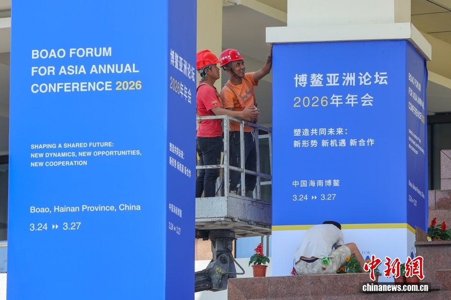 3月17日,博鰲亞洲論壇2026年年會各項籌備工作正有序推進,海南博鰲街頭的盛會氛圍日漸濃厚。以“塑造共同未來:新形勢、新機遇、新合作”為主題的博鰲亞洲論壇2026年年會將于3月24日至27日在海南博鰲召開。圖為工作人員在博鰲亞洲論壇永久會址安裝年會主題展板。中新社記者 駱云飛 攝