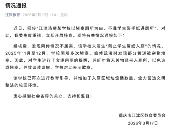 經(jīng)核查,發(fā)現(xiàn)網(wǎng)傳情況不屬實,該學(xué)校未發(fā)生“禁止學(xué)生帶紙入廁”的情況。2025年11月至12月,學(xué)校廁所多次堵塞,維修疏時發(fā)現(xiàn)部分管道被雜物堵塞。因此,對學(xué)生進行了文明用廁的提醒,呼吁勿將無關(guān)物品帶入廁所,以免造成堵塞。導(dǎo)致誤讀誤解,學(xué)校對此表示歉意。