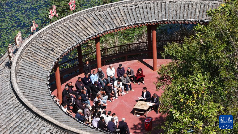 4月19日拍攝的泗洪縣上塘鎮(zhèn)墊湖村村民代表票決民生實事現場(無人機照片)。