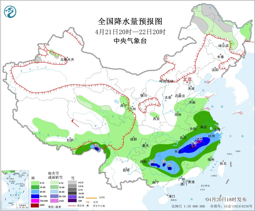 4月20日20時(shí)至21日20時(shí),內(nèi)蒙古東北部、黑龍江西北部、新疆沿天山地區(qū)、青海中部和東北部、甘肅河西等地部分地區(qū)有小雪或雨夾雪,其中,內(nèi)蒙古東北部、黑龍江西北部等地部分地區(qū)有中到大雪(5~8毫米)。西北地區(qū)東南部、黃淮西部、江漢東部、江南大部、四川盆地東北部、華南西部、北部和東南部等地部分地區(qū)有中到大雨,其中,湖南南部和東部、江西中北部、廣西東北部等地部分地區(qū)有暴雨,局地大暴雨(100~160毫米)。內(nèi)蒙古中東部、吉林、黑龍江東南部以及新疆南疆盆地、西藏北部、青海中西部等地部分地區(qū)有5~7級(jí)風(fēng),陣風(fēng)8~9級(jí),其中內(nèi)蒙古中部、吉林中東部等地局地有8~9級(jí)風(fēng),陣風(fēng)10級(jí)以上;渤海、渤海海峽、黃海北部部分海域?qū)⒂?級(jí)、陣風(fēng)8級(jí)的大風(fēng)(見(jiàn)圖3)。