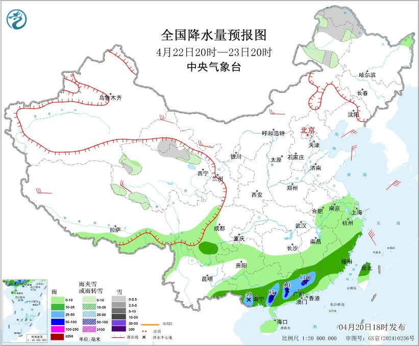 4月22日20時(shí)至23日20時(shí),內(nèi)蒙古東北部、黑龍江西北部、青藏高原北部、甘肅河西等地部分地區(qū)有小雪或雨夾雪。江南東部和南部、華南中南部等地部分地區(qū)有中到大雨,其中,廣西東南部、廣東西部和北部等地部分地區(qū)有暴雨或大暴雨(100~110毫米)。內(nèi)蒙古大部、遼東半島、山東半島、甘肅河西、青藏高原等地部分地區(qū)有4~6級(jí)風(fēng)。東海北部海域?qū)⒂?~8級(jí)大風(fēng)、陣風(fēng)9級(jí);黃海南部海域、東海南部海域、臺(tái)灣海峽、臺(tái)灣以東洋面、北部灣將有5~6級(jí)大風(fēng)、陣風(fēng)7級(jí)(見(jiàn)圖5)。