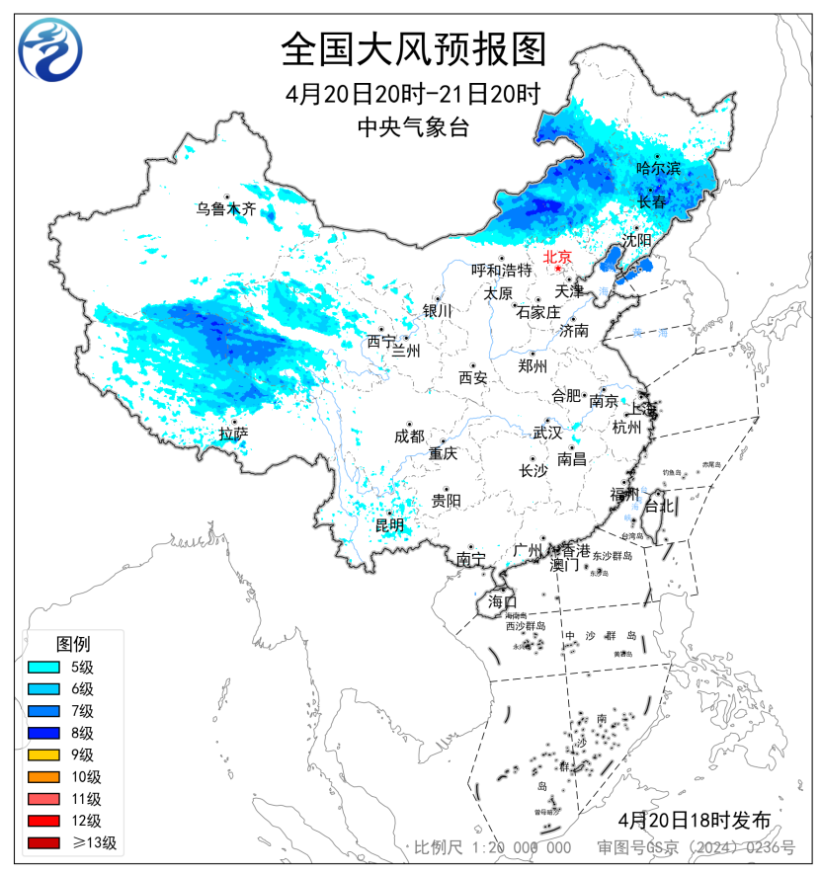 預(yù)計(jì)4月20日20時(shí)至21日20時(shí),內(nèi)蒙古中東部、吉林、黑龍江東南部以及新疆南疆盆地、西藏北部、青海中西部等地部分地區(qū)有5~7級(jí)風(fēng),陣風(fēng)8~9級(jí),其中內(nèi)蒙古中部、吉林中東部等地局地有8~9級(jí)風(fēng),陣風(fēng)10級(jí)以上;渤海、渤海海峽、黃海北部部分海域?qū)⒂?級(jí)、陣風(fēng)8級(jí)的大風(fēng)(見(jiàn)圖2)。中央氣象臺(tái)4月20日18時(shí)發(fā)布大風(fēng)藍(lán)色預(yù)警。