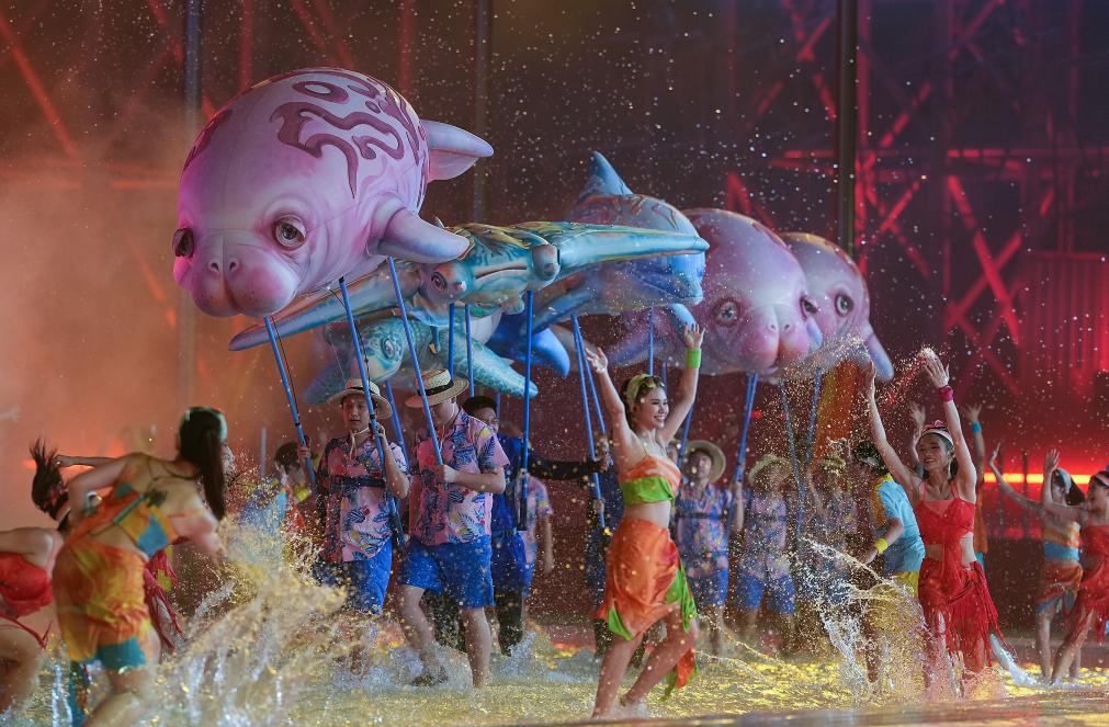 全場燈光轉(zhuǎn)為夢幻的深藍色,巨型水母在空中漂移,儒艮、鯨鯊、海龜游弋于觀眾席。潛水員海底探秘,與紅珊瑚翩然共舞。此刻,蔚藍同脈,萬物共生——光影交織的海底世界里,流淌著人與自然和諧相處的哲學智慧。