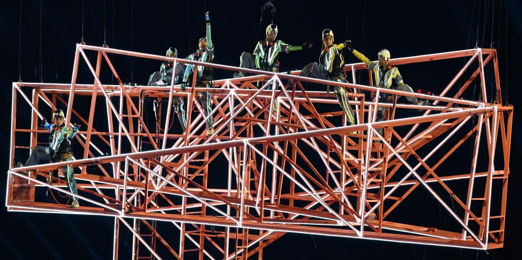 音樂重新變得動感十足,“亞亞”變身自貿(mào)港建設者再次登場。8組空中威亞裝置通過矩陣組合,變換成大型吊臂、拱形橋梁與深海鉆井平臺,寓意拔地而起的“夢想巔峰”。逐夢者在巨大的鋼架道具上奮力攀登、彼此托舉,象征著自貿(mào)港建設者攻堅克難的歷程。