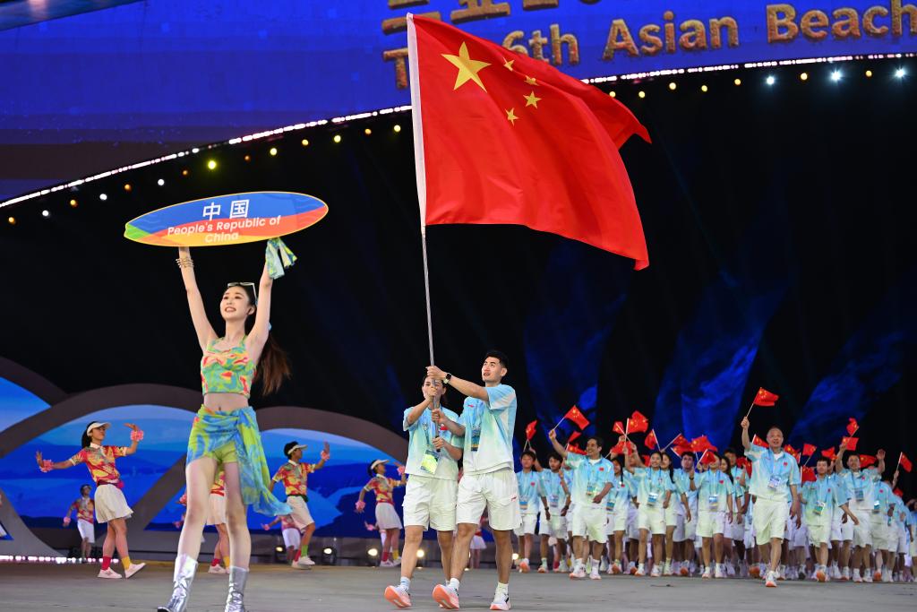 耀眼“中國紅”來了!沙灘手球運動員沈萍和三人籃球運動員顏鵬帶領中國體育代表團入場。此次中國代表團共派出255人,包括171名運動員,將參加除沙灘卡巴迪外13個大項、60個小項的比賽,是我國參加亞沙會以來參賽率最高的一屆。