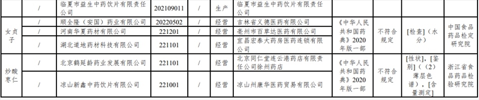 經浙江省食品藥品檢驗研究院檢驗,標示為北京鶴延齡藥業(yè)發(fā)展有限公司、涼山新鑫中藥飲片有限公司生產的2批次炒酸棗仁不符合規(guī)定,不符合規(guī)定項目包括性狀、鑒別、含量測定。
