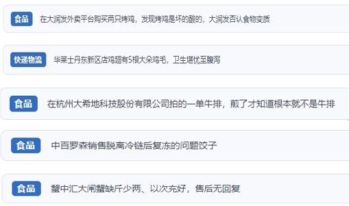 “人民投訴”上不少網(wǎng)友反映,“外賣商家銷售排骨套餐中含過期飲料”“外賣店鋪吃出蟑螂,商家不按照食品安全法賠償” “直播間購買車?yán)遄樱摷傩麄?J、原裝進(jìn)口,到貨嚴(yán)重貨不對板”“網(wǎng)購東北珍珠貢米,到貨包裝上執(zhí)行標(biāo)準(zhǔn)是廢止的標(biāo)準(zhǔn)”“超市買的梅花肉切開發(fā)現(xiàn)是淋巴肉”“平臺商家承諾枸杞不熏硫酸,實則檢測后含硫超標(biāo)”“知名便利店售賣脫離冷鏈后多次復(fù)凍的餃子”等。