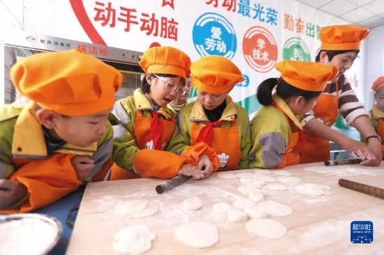 3月28日,青島市即墨藍(lán)谷高新區(qū)東皋埠小學(xué)的學(xué)生在“烹飪課堂”上學(xué)習(xí)搟餃子皮。