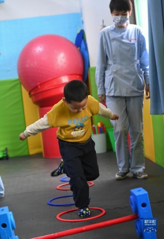 3月30日,在西安市金色陽光康復(fù)中心,孩子們在特教老師的保護(hù)下進(jìn)行康復(fù)訓(xùn)練。