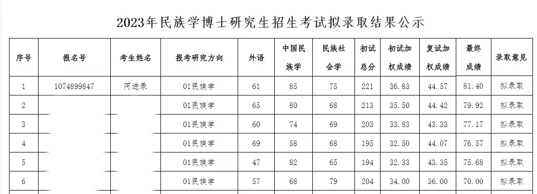 記者了解到,4月9日,青海民族大學(xué)研究生院官方網(wǎng)站發(fā)布《青海民族大學(xué)2023年民族學(xué)博士研究生招生考試擬錄取結(jié)果公示》。該公示稱,經(jīng)2023年青海民族大學(xué)博士招生工作領(lǐng)導(dǎo)小組審議通過,擬錄取17位考生為民族學(xué)博士研究生。根據(jù)公示,考生阿進(jìn)錄以最終成績81.40分進(jìn)入擬錄取名單,在民族學(xué)(報考研究方向)擬錄取的6名考生中排名第一。(李依環(huán)、實(shí)習(xí)生遇鏡霖)