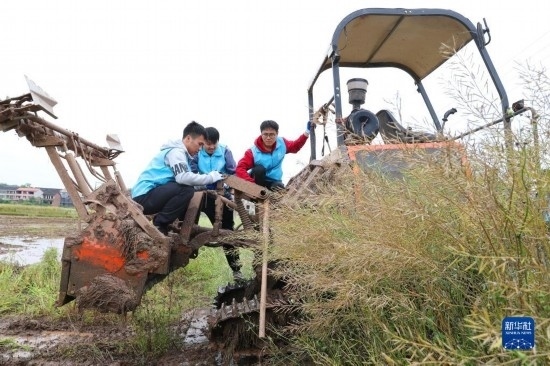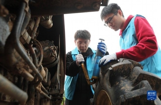 4月29日,在衡陽(yáng)縣西渡鎮(zhèn)新橋村,南華大學(xué)的大學(xué)生志愿者在檢修農(nóng)機(jī)。