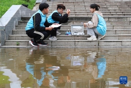 4月29日,在衡陽(yáng)縣西渡鎮(zhèn)新橋村,南華大學(xué)的大學(xué)生志愿者在檢測(cè)水質(zhì)。