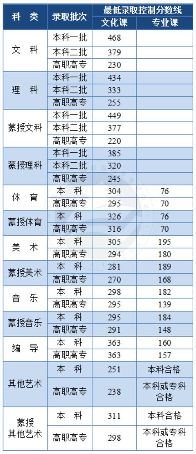 內蒙古普通高考最低錄取控制分數(shù)線