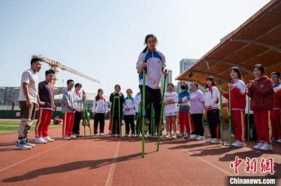 3月19日,香港學(xué)生體驗少數(shù)民族傳統(tǒng)體育項目《高蹺》。唐哲 攝