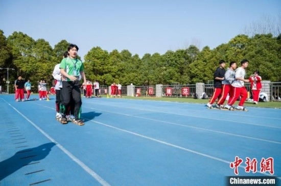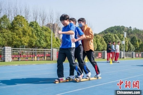 3月19日,兩地學(xué)生一起體驗少數(shù)民族傳統(tǒng)體育項目《板鞋競技》。唐哲 攝