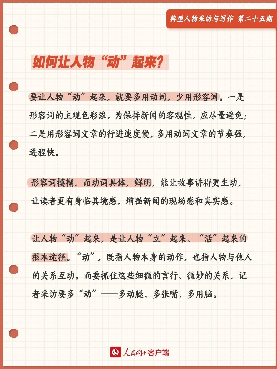 要讓人物“動”起來,就要多用動詞,少用形容詞。為什么?一是形容詞的主觀色彩濃,為了保持新聞的客觀性,應(yīng)盡量避免;二是用形容詞文章的行進(jìn)速度慢,多用動詞文章的節(jié)奏強(qiáng),進(jìn)程快。形容詞模糊,而動詞具體,鮮明,能讓故事講得更生動,讓讀者更有身臨其境感,增強(qiáng)新聞的現(xiàn)場感和真實(shí)感。