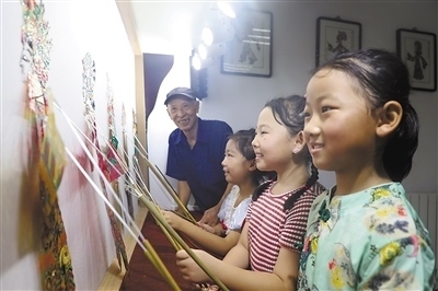 非遺體驗河北省唐山市豐潤區(qū)浭陽街道華府社區(qū)開設(shè)“非遺”小課堂,小朋友們在學(xué)習表演皮影戲。 朱大勇攝(人民視覺)