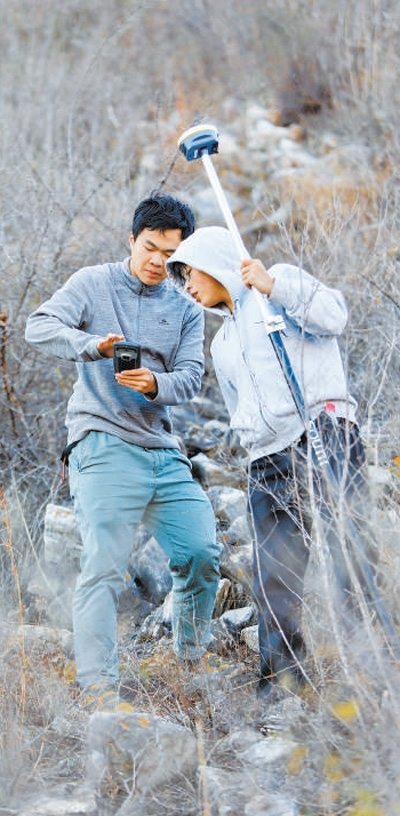 北京聯(lián)合大學(xué)地理學(xué)碩士研究生在北京房山區(qū)穆家口古城址四普現(xiàn)場(chǎng)測(cè)量文物地理坐標(biāo)。