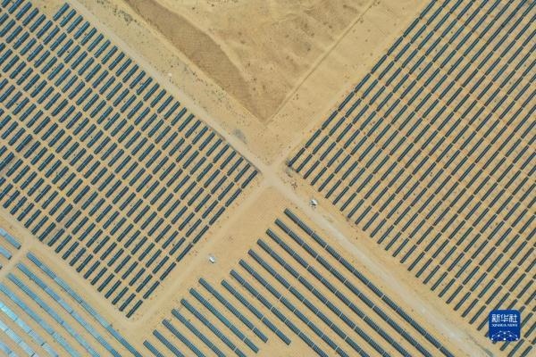 一匹占地130多萬平方米的沙漠“駿馬”橫臥在內(nèi)蒙古自治區(qū)庫布其沙漠之中,這是位于達(dá)拉特光伏發(fā)電應(yīng)用領(lǐng)跑基地中、由近20萬塊光伏板組成的“駿馬電站”。該電站采用“林光互補(bǔ)”模式,板上發(fā)電、板下種植,在開發(fā)利用庫布其沙漠豐富太陽能資源的同時,推動沙漠生態(tài)治理。