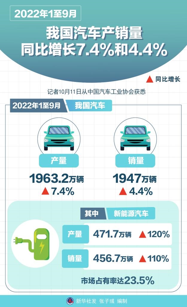 記者11日從中國汽車工業(yè)協(xié)會獲悉,今年1至9月,我國汽車產銷量分別達1963.2萬輛和1947萬輛,同比增長7.4%和4.4%。其中,新能源汽車產銷量分別達471.7萬輛和456.7萬輛,同比增長120%和110%,市場占有率達23.5%。