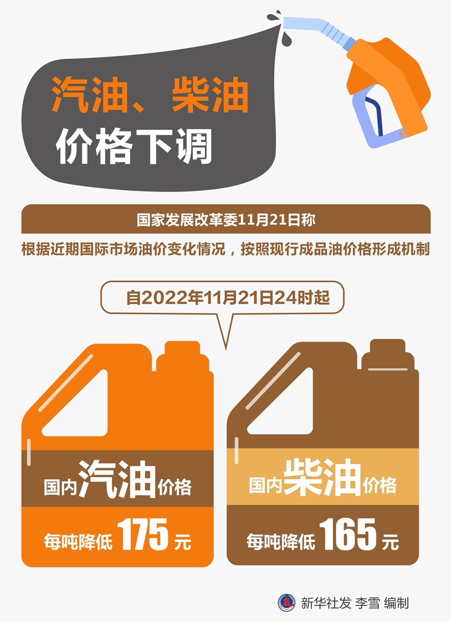 國家發(fā)展改革委21日稱,根據近期國際市場油價變化情況,按照現(xiàn)行成品油價格形成機制,自2022年11月21日24時起,國內汽油、柴油價格每噸分別降低175元和165元。