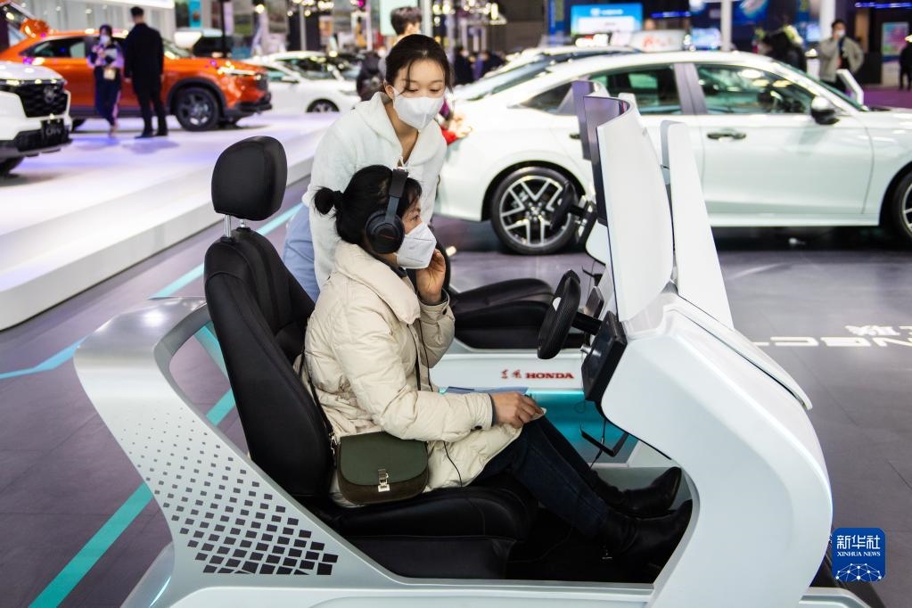 12月24日,在長沙國際會展中心,觀眾(前)在虛擬駕駛艙上體驗。新華社記者 陳思汗 攝