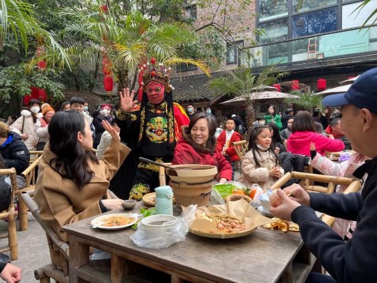 春節(jié)期間,重慶市渝中區(qū)山城巷中,“山城壩壩”茶館的院壩內(nèi)坐滿(mǎn)了客人。人們一邊圍爐煮茶,一邊欣賞臺(tái)上的傳統(tǒng)藝術(shù)表演,川劇變臉演員剎那間切換臉譜,贏得滿(mǎn)堂喝彩。老板舒蓉?zé)崆檎泻糁腿?,將茶水、點(diǎn)心端到桌上,忙得不亦樂(lè)乎?!敖衲甏汗?jié)的客流量遠(yuǎn)超預(yù)期,營(yíng)業(yè)額是去年同期的七八倍?!?/p>