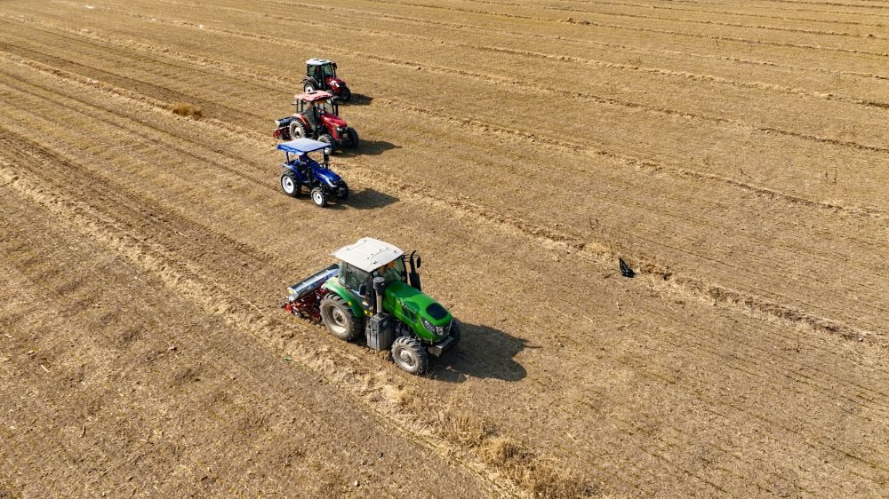 樂陵市來秋農(nóng)機服務專業(yè)合作社的四臺新式追肥機正在麥田進行追肥作業(yè)。
