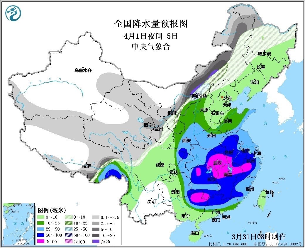4月1日夜間至5日,甘肅東部、寧夏、河北北部和內(nèi)蒙古中東部等地有中到大雪或雨夾雪,內(nèi)蒙古中部等地局地暴雪或大暴雪,主要降雪時段為2日至3日;西北地區(qū)東南部、西南地區(qū)東部、江漢、江淮、江南、華南以及黃淮等地有中到大雨,其中河南東南部、湖北東部、湖南、安徽、江西、浙江西部、廣西北部、廣東北部和福建西部等地的部分地區(qū)有暴雨,局地大暴雨;主要降水時段為2日至4日。上述地區(qū)累計降水量20-50毫米,部分地區(qū)有70-120毫米,局地可達160毫米;100毫米以上降雨覆蓋面積達23萬平方公里。江淮及以南地區(qū)伴有短時強降水、雷暴大風或冰雹等強對流天氣,最大小時降水量30-60毫米;江南北部、江漢東部、江淮等地伴有10級以上雷暴大風。