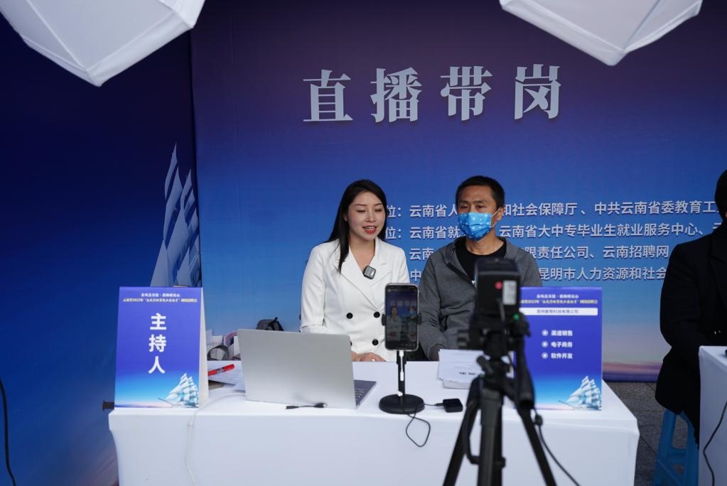 2023年3月3日,在云南省2023年春風(fēng)行動(dòng)暨就業(yè)援助月專場(chǎng)招聘活動(dòng)現(xiàn)場(chǎng),工作人員“直播帶崗”。新華社記者 佟璐 攝