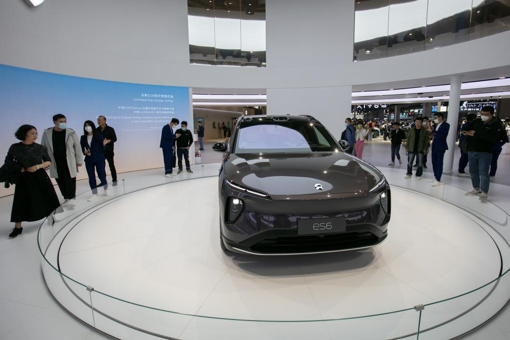4月25日,人們?cè)谏虾\囌股蠀⒂^正式首發(fā)亮相的蔚來全新ES6。新華社記者王翔攝