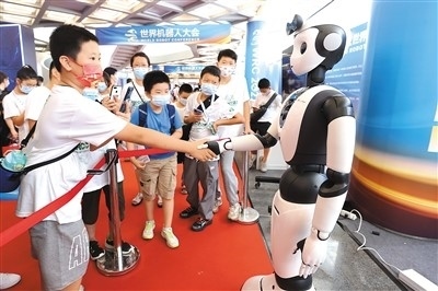 在北京亦創(chuàng)國(guó)際會(huì)展中心舉行的2022世界機(jī)器人博覽會(huì)上,小觀眾在與智能服務(wù)機(jī)器人握手。陳曉根攝(人民視覺)