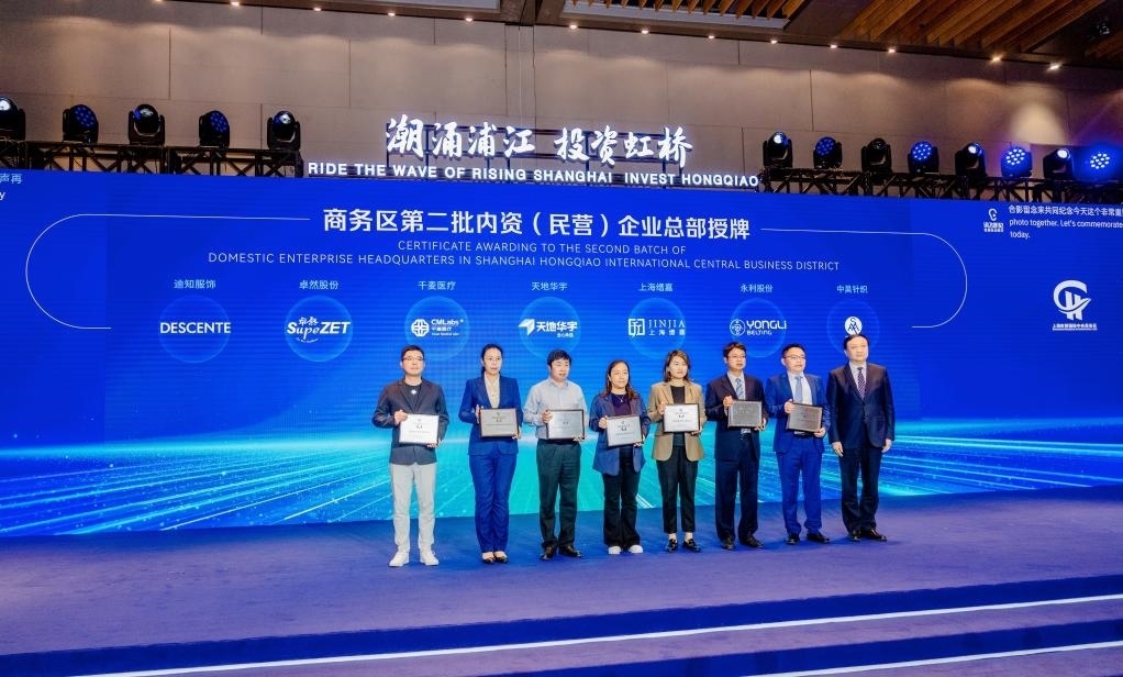 5月25日,“潮涌浦江·投資虹橋”2023虹橋國際中央商務(wù)區(qū)投資促進大會現(xiàn)場,7家新認定的內(nèi)資(民營)企業(yè)總部集體授牌。新華社記者周蕊 攝