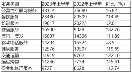 在具體服務(wù)投訴中,投訴量居前五位的分別為(如圖5、表5所示)經(jīng)營性互聯(lián)網(wǎng)服務(wù)、餐飲服務(wù)、培訓(xùn)服務(wù)、住宿服務(wù)、美容美發(fā)。與2022年上半年相比,住宿服務(wù)、遠程購物、保養(yǎng)和修理服務(wù)進入服務(wù)類投訴前十。其中,住宿服務(wù)、遠程購物投訴量同比顯著增長,移動電話服務(wù)投訴量同比有所下降。