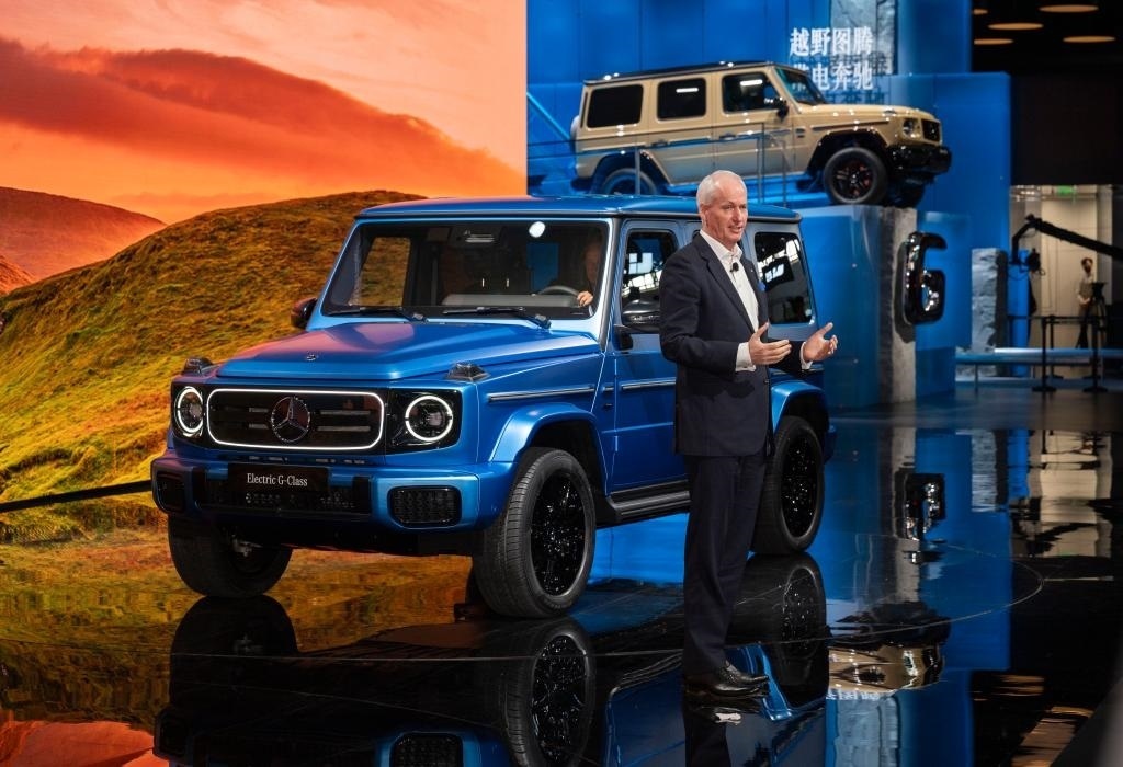 4月25日,在北京中國國際展覽中心順義館舉行的2024北京車展上,梅賽德斯—奔馳集團(tuán)股份公司董事會成員唐仕凱介紹梅賽德斯—奔馳純電G級越野車。新華社記者 才揚 攝