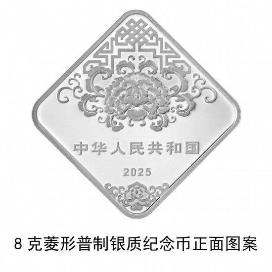 8克菱形銀質(zhì)紀(jì)念幣背面圖案為貼“?!弊謭鼍埃⒖骖~。