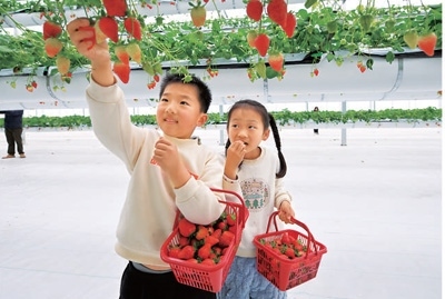 孩子們在懸掛式草莓大棚里采摘。