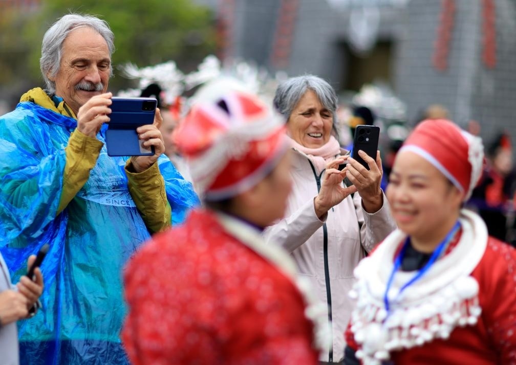 4月12日,外國(guó)游客在貴州省黔東南苗族侗族自治州臺(tái)江縣舉行的“苗族姊妹節(jié)”慶?;顒?dòng)上拍攝。新華社記者劉續(xù) 攝