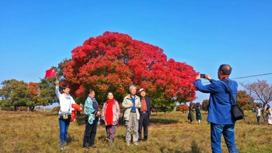 五角楓紅了,人們?cè)趤?lái)到這里載歌載舞慶豐收。梁永峰 攝