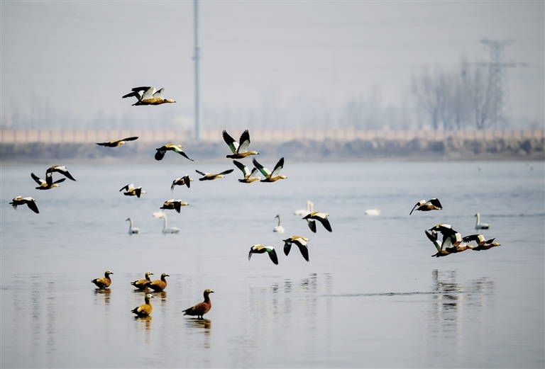 土默特左旗森林公安局副局長王強(qiáng)告訴記者,隨著生態(tài)環(huán)境的日益改善,海流水庫已成為候鳥遷徙途中的重要棲息“驛站”,每年春秋兩季在海流水庫過境的候鳥高達(dá)百萬只,種類涉及天鵝、遺鷗、大雁、蒼鷺等十余種,其中不乏國家一、二級重點(diǎn)保護(hù)動物。更可喜的是,現(xiàn)在海流水庫已經(jīng)有赤麻鴨長期駐留。