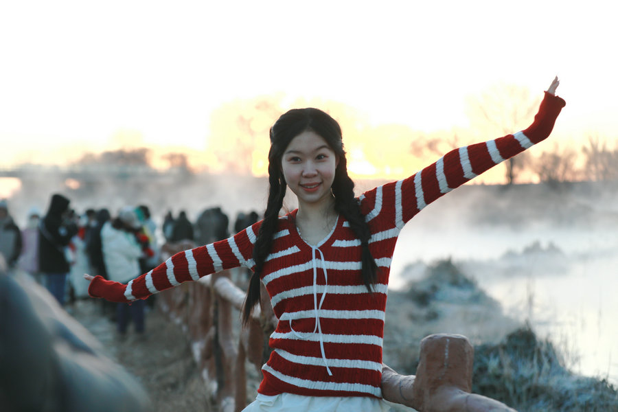 12月15日,游客在塞外“千島湖”畔拍照打卡