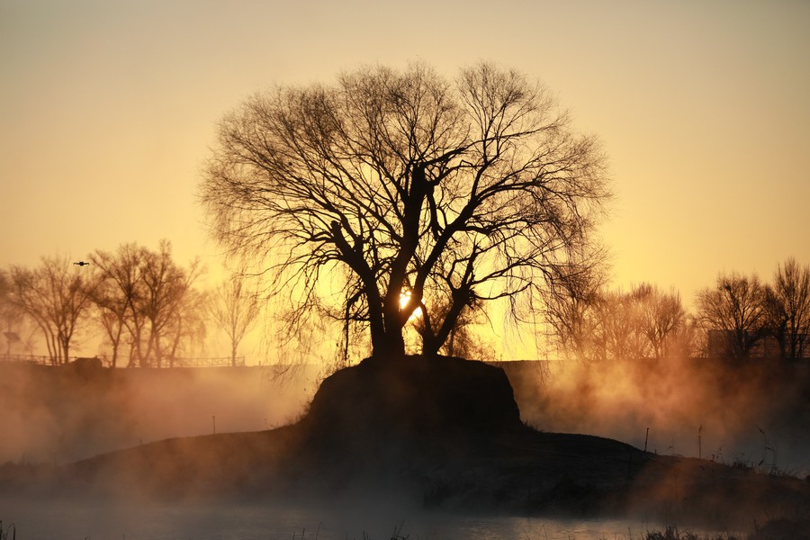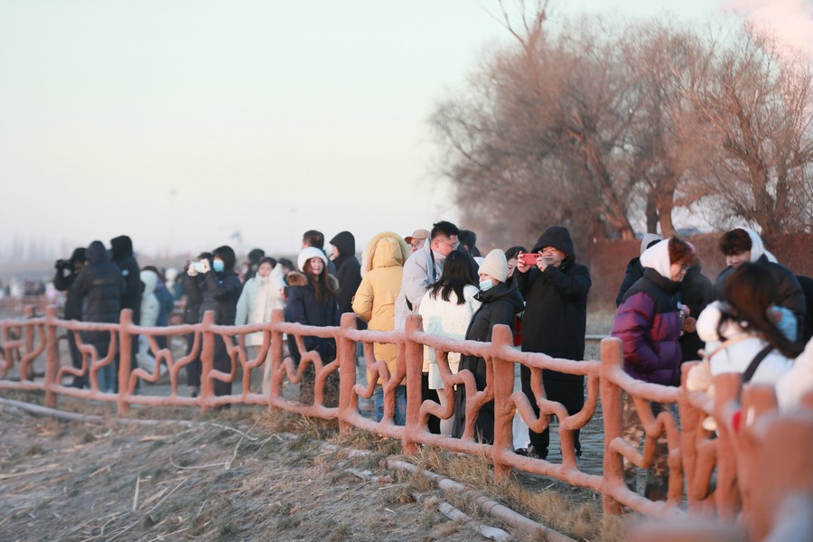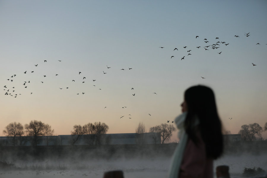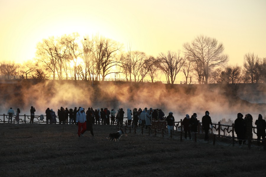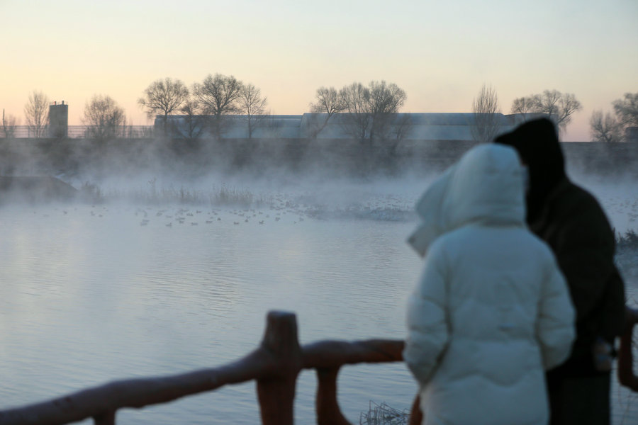 12月15日清晨,上千名游人在呼和浩特玉泉區(qū)班定營村南側的塞外“千島湖”畔賞景打卡。此處湖水為城市污水經處理達標后的再生水,隆冬時節(jié),再生水流入湖中,水汽蒸騰,岸邊草木霧凇皚皚,良好的生態(tài)吸引了數萬只赤麻鴨在此翔集棲息,構成一幅生動和諧的美麗畫面。每日清晨,都有上千名游客來此觀日出賞美景。