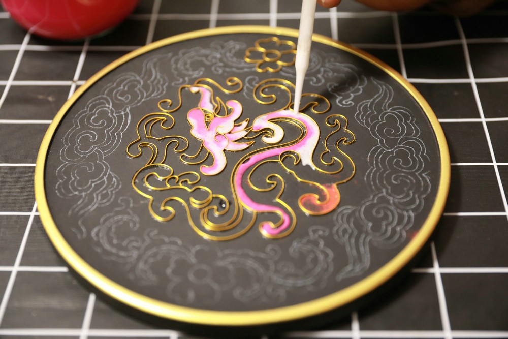 姬增正在制作景泰藍掐絲琺瑯畫