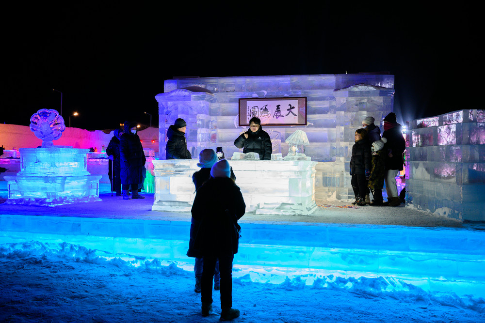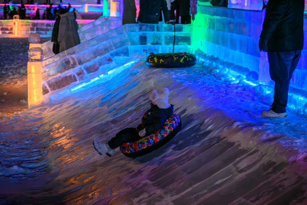園區(qū)內(nèi)更是熱鬧非凡。中式“北國第一門”、俄式童話城堡、蒙式游牧風(fēng)情三大特色入口,成了游客打卡的首選地。258米長的中式主題雪墻鋪展著“萬里茶道”的傳奇故事,復(fù)古火車站、蒸汽機(jī)車雪雕復(fù)刻著中東鐵路的舊時(shí)光,隨手一拍都是自帶氛圍感的大片。冰雪滑梯、雪地碰碰球等十余項(xiàng)娛樂項(xiàng)目前排起了長隊(duì),大人小孩都玩得不亦樂乎;蒙古包暖屋里,熱氣騰騰的奶茶、鮮燉烤梨香氣四溢,暖心又暖胃??萍几欣瓭M了游玩體驗(yàn),不少游客拿著手機(jī)掃碼體驗(yàn)語言冰書冰墻,中俄蒙常用語一學(xué)就會(huì),還有炫彩音樂噴泉冰柱打造互動(dòng)琴鍵裝置,時(shí)光之門光幕呈現(xiàn)科幻特效。