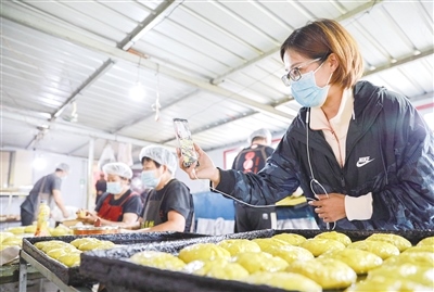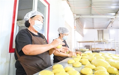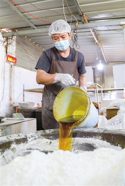 “我們堅持手工制作,就是想留住這個味道!”常三文是隆盛莊月餅制作技藝非遺傳承人,他帶記者來到了打月餅的作坊。一個約60平方米的房間里有兩個大鐵鍋,一個鐵鍋里熬著糖水,另一個鐵鍋用來和面。一名男工將面粉、熟胡麻油、糖水等按比例倒入鐵鍋,然后用鐵鏟攪拌起來。鐵鍋旁邊是一個做月餅的大案板,4個女工稱重、分劑、做胚、擺放,各自忙活著。常三文的兒子常曉峰負責將擺放好的月餅放進燒爐火的烤爐,計時、下簽子、刷油……直至月餅烤制完成出爐。